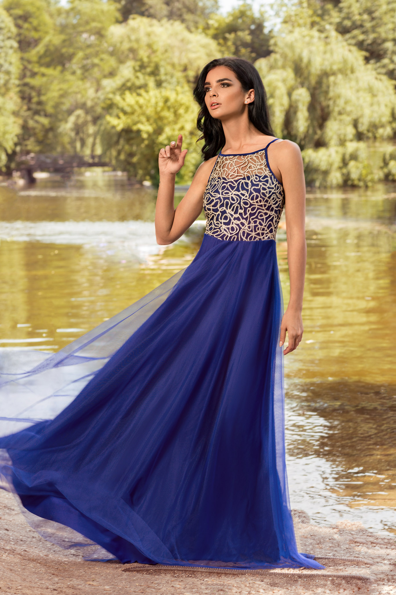 - rochii din matase plisata, picatate cu flori, talia delimitand o fusta ampla, iar bretele fine ale rochii conturand un top delicat. Rochia poate fi purtata cu pantofi stiletto, fara accesorii;